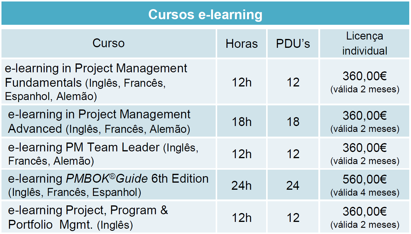 Assim, e porque queremos que se mantenha ativo e esteja preparado para estes desafios, a PPM Coachers disponibiliza cursos de e-learning base e avançados em Gestão de Projetos, disponíveis em várias línguas. Adicionalmente, temos também packages específicos de preparação para o exame PMP® e CAPM®. Poderá consultar as páginas 61 a 66 do nosso Catálogo de Formação para mais informações sobre estes cursos.